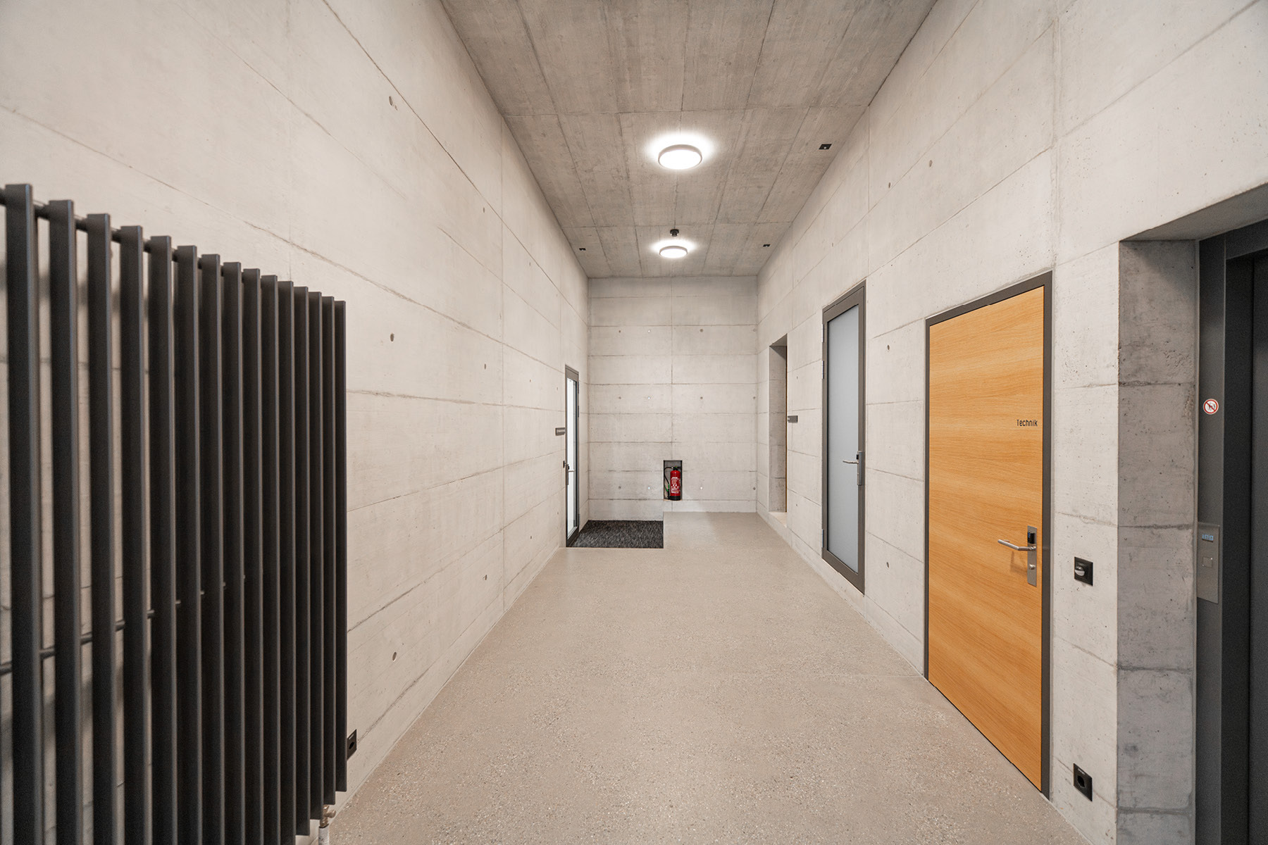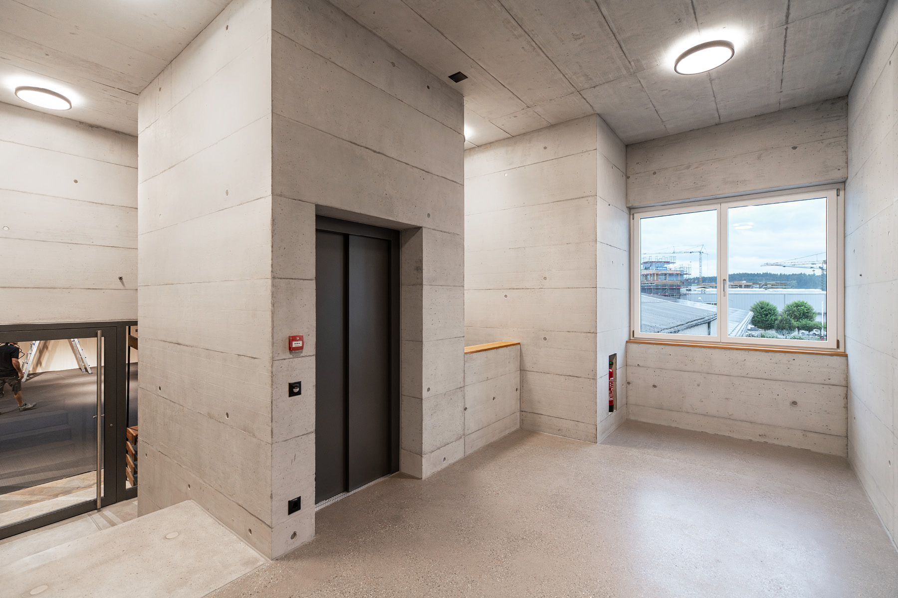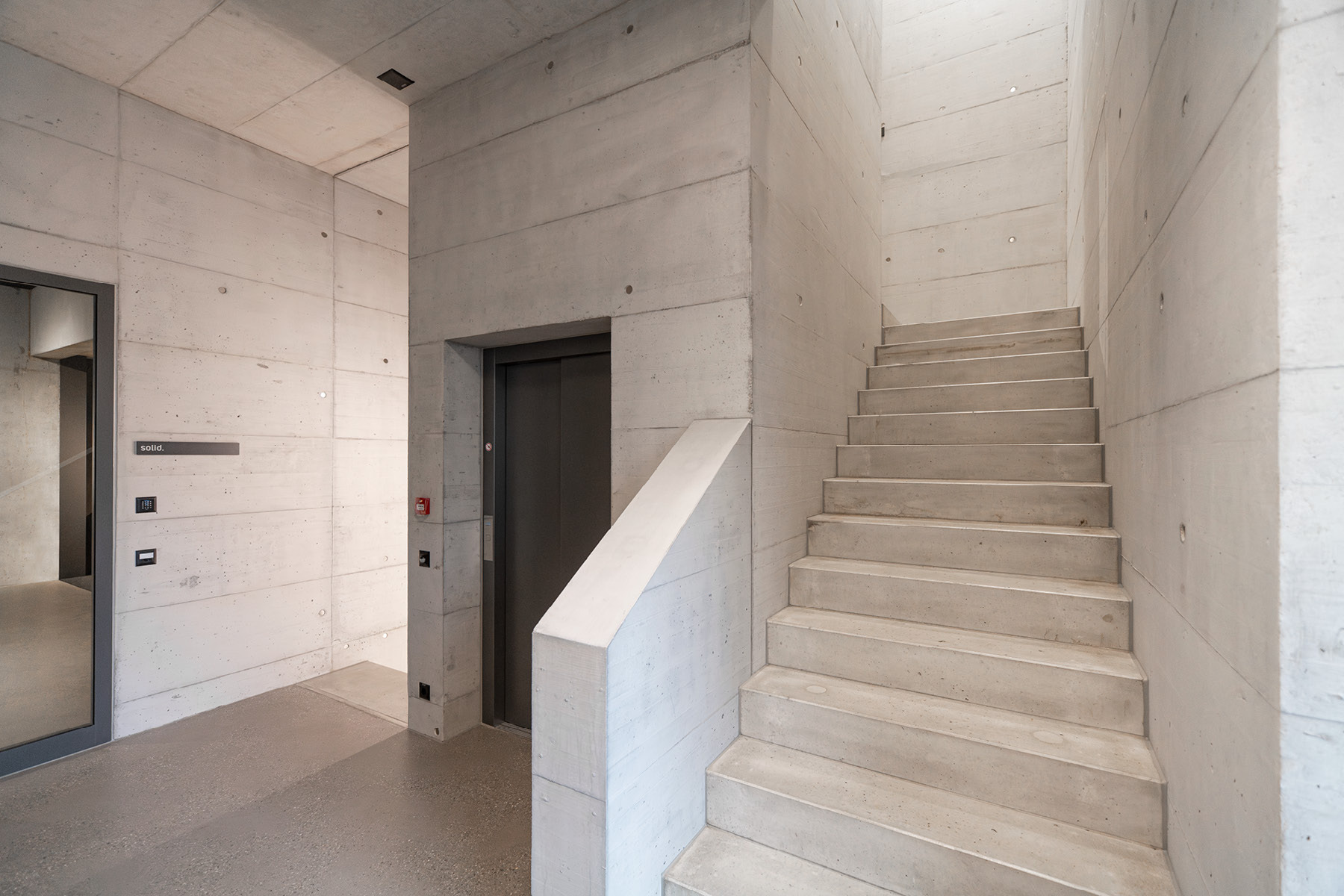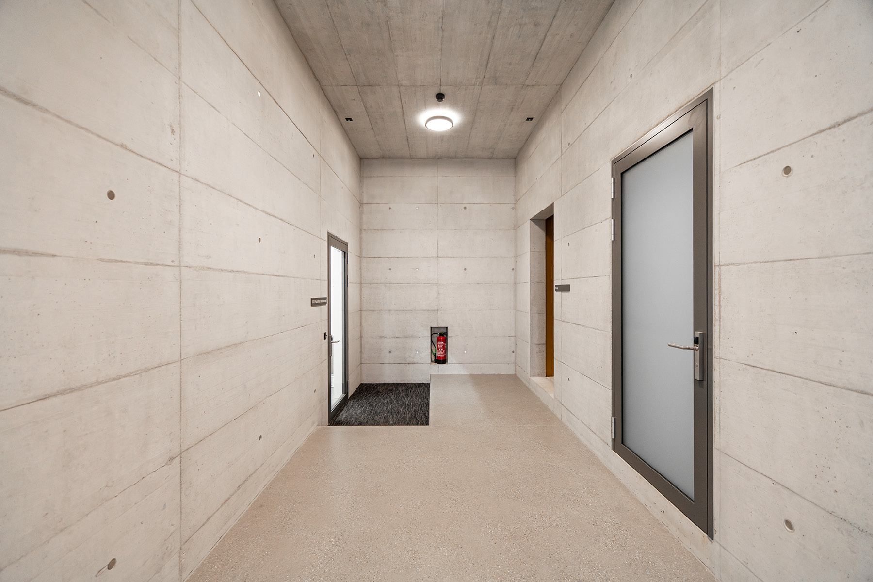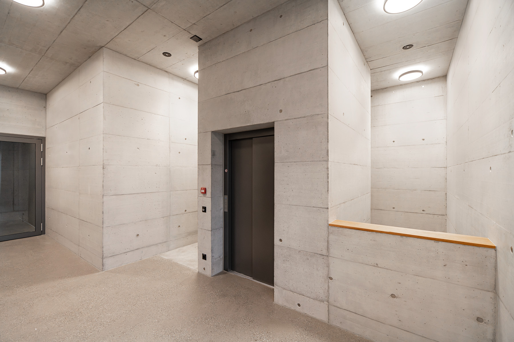 In direkter Anlehnung an das Sichtbetontreppenhaus des ersten Neubaus wurde auch das Sichtbetontreppenhaus Typ 4.3 im Erweiterungsbau mit identischen gestalterischen und handwerklichen Anforderungen realisiert. Die gleichmässigen Sichtbetonflächen in einheitlicher Schaltafelstruktur prägen den Raum mit Klarheit und Ruhe. Präzise ausgeführte, scharfkantige Ecken sowie die hohe Oberflächenqualität widerspiegeln den konsequent durchgezogenen Qualitätsstandard – schlicht, kraftvoll und zeitlos.