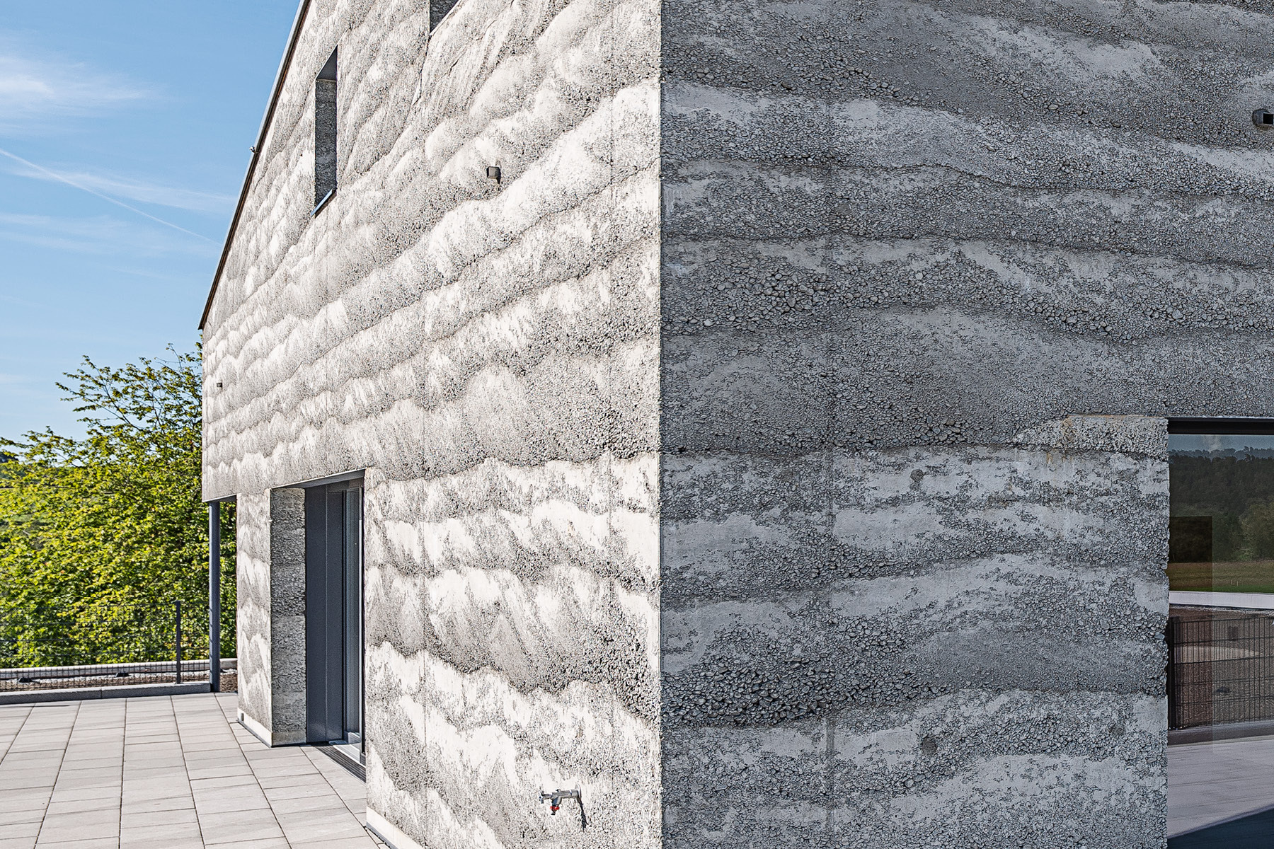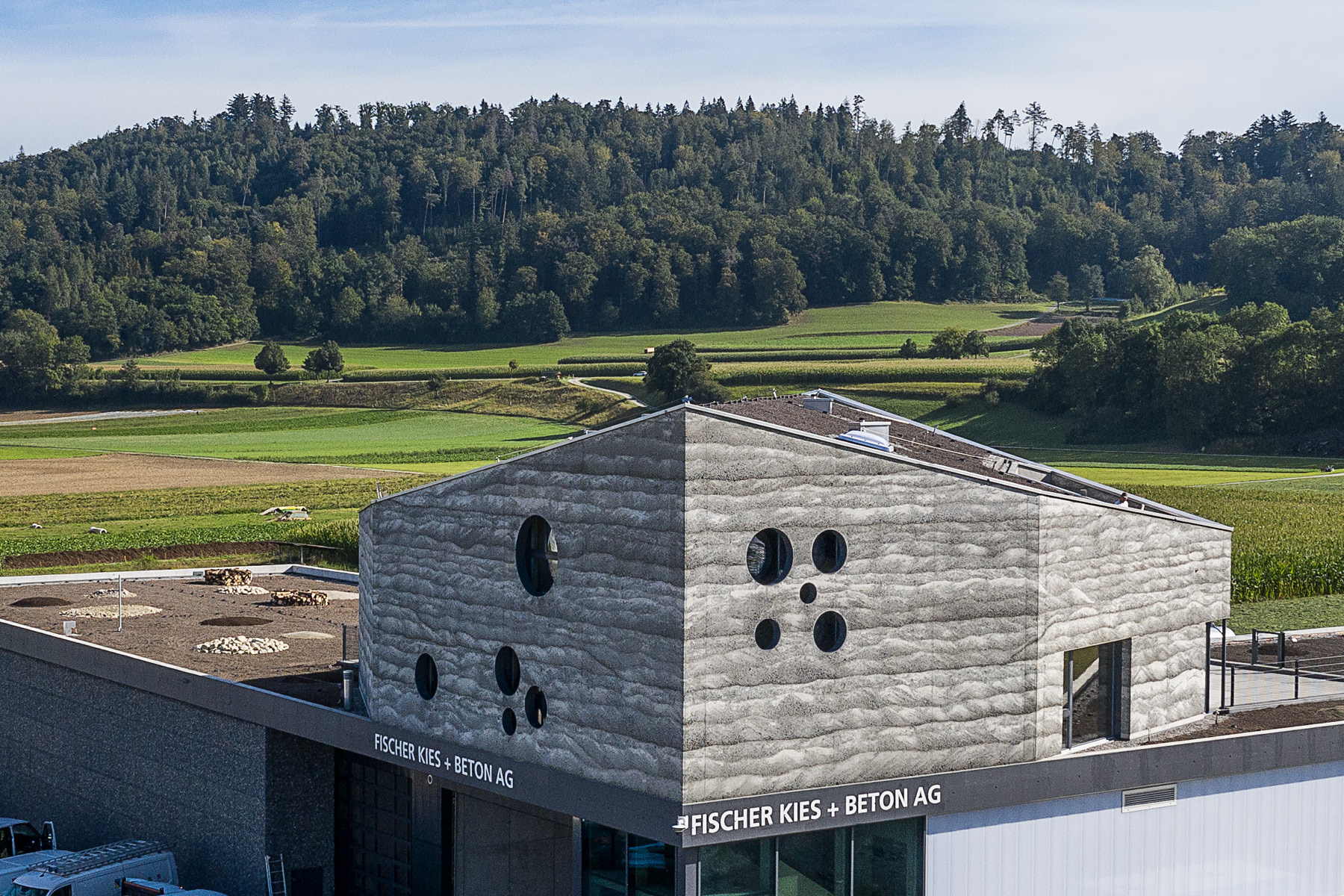 Die einzigartige Hülle dieses Gebäudes zieht wie ein Magnet alle Blicke auf sich. Durch den von Hand eingebrachten und gestampften Beton verlaufen die Schichten nicht linear, sondern wellenförmig.