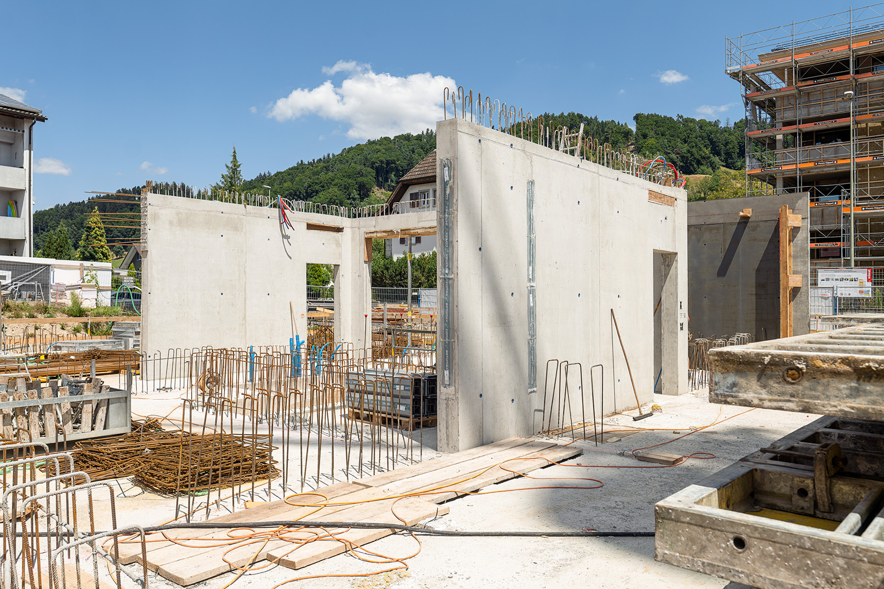 Da die Platzverhältnisse sehr eng sind, müssen Materiallieferungen «just in time» erfolgen. Der knappe Platz ist auch der Grund, weshalb der Kran mit einem einbetonierten Fundamentkreuz in die Bodenplatte verankert wurde. Um den Zentralballast des Krans ersetzen zu können, wurde ein Fundament mit 80 m³ Beton erstellt. Herzstück des Neubaus ist das Treppenhaus mit Sichtbeton-Bauteilen in Ortbeton sowie den mit Weisszement eingefärbten Elementtreppen. Aufgrund ihres hohen Gewichts müssen diese mit einem Autokran versetzt werden.