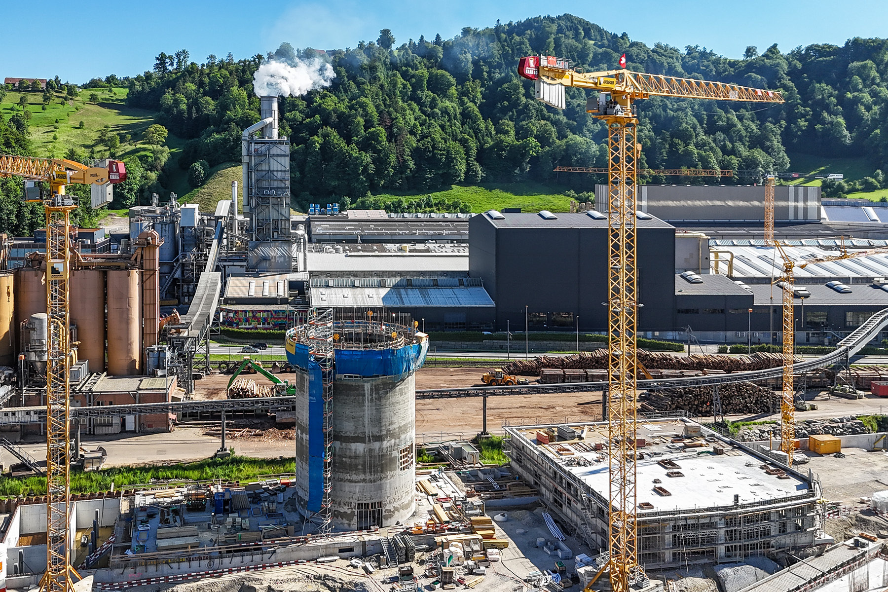 Überirdisch wird eine umfassende Recyclinganlage errichtet, die in verschiedene Objektteile unterteilt ist, darunter Brecheranlagen, Siebanlagen und eine separate Abladestation für die Anlieferungen. Besonders hervorzuheben sind die Ortbetonsilos, welche mit einer Gleitschalung im 24-Stunden-Schichtbetrieb errichtet werden und in nur rund sieben Tagen eine Höhe von 32 Metern erreichen. Die Silos bieten wir als Teilauftrag inklusive der Planung an. Sämtliche Arbeiten werden während des laufenden Betriebs der Swiss Krono AG durchgeführt.