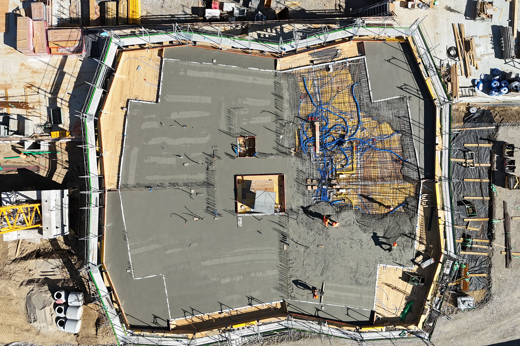 Die Wohnüberbauung Küngoldpark ist ein anspruchsvolles Neubauprojekt, das insgesamt vier Mehrfamilienhäuser mit 100 modernen Wohnungen umfasst. Der Rohbau wird innerhalb eines Jahres erstellt, was eine effiziente Logistik und exakte Planung erfordert. Möglich wird dies auch durch die enge Zusammenarbeit der Aregger AG, die sowohl die Hochbau- als auch die Tiefbauarbeiten übernimmt. Dies ermöglicht eine optimale Schnittstelle zwischen beiden Gewerken und sorgt für einen reibungslosen Übergang der Aushubarbeiten bis hin zum fertigen Rohbau. Neben der gemeinschaftlichen Autoeinstellhalle besticht das Objekt durch hochwertige architektonische Details. Das Treppenhaus sowie die Balkone in Sichtbeton verleihen den Gebäuden einen modernen Ausdruck und setzen auf elegante Einfachheit. Ein weiteres auffälliges Designelement sind die vorgehängten 80 Stahlstützen der Balkone, die sowohl funktionale als auch ästhetische Akzente setzen und den Gebäuden einen besonderen Wiedererkennungswert verleihen.