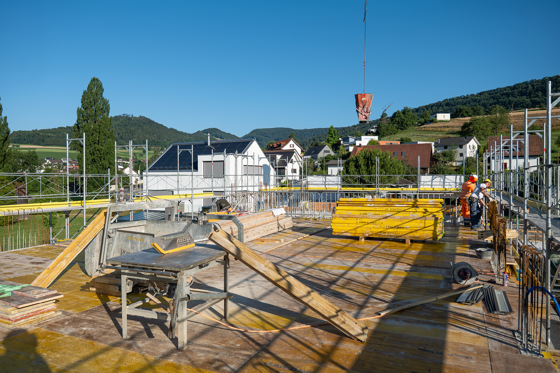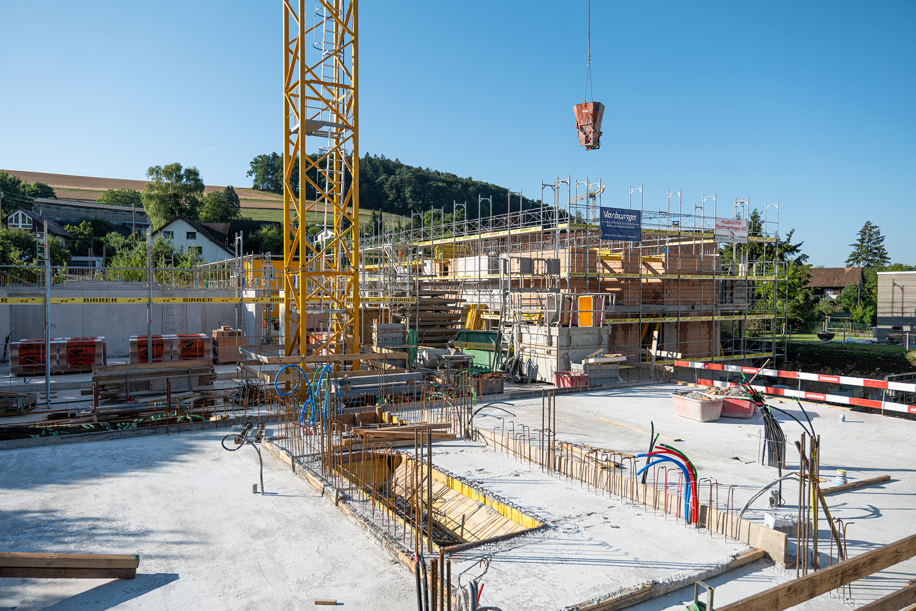 Die Wohnüberbauung «Gerenbach» besteht aus drei Mehrfamilienhäusern mit je vier Wohnungen sowie einer gemeinsamen Einstellhalle und Parkanlage. Die Platzverhältnisse sind stark eingeschränkt: Auf zwei Seiten liegen die Aushubböschungen an der Parzellengrenze, auf einer Seite grenzt der Gerenbach, wodurch dem Gewässerschutz besondere Beachtung geschenkt werden muss. Zudem reicht die Baugrube auf der vierten Seite bis auf zwei Meter an die stark befahrene Strasse, was den Warenumschlag erschwert. Die Aregger-Crew unter Polier Lulzim Dervishi meisterte ihre Aufgaben bislang sehr zuverlässig und wurde von der Bauherrschaft bereits mit einem Folgeauftrag in Oberentfelden belohnt.