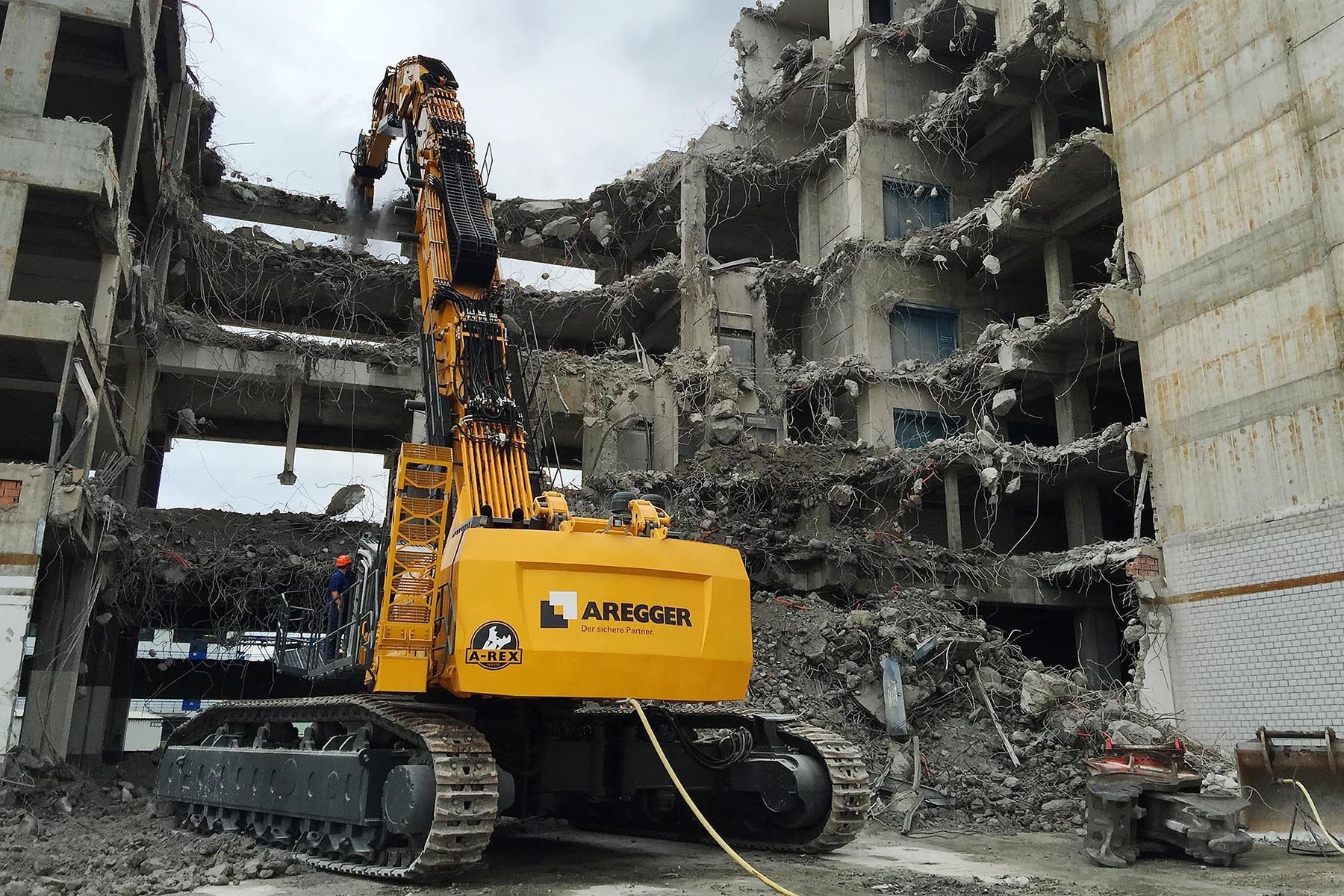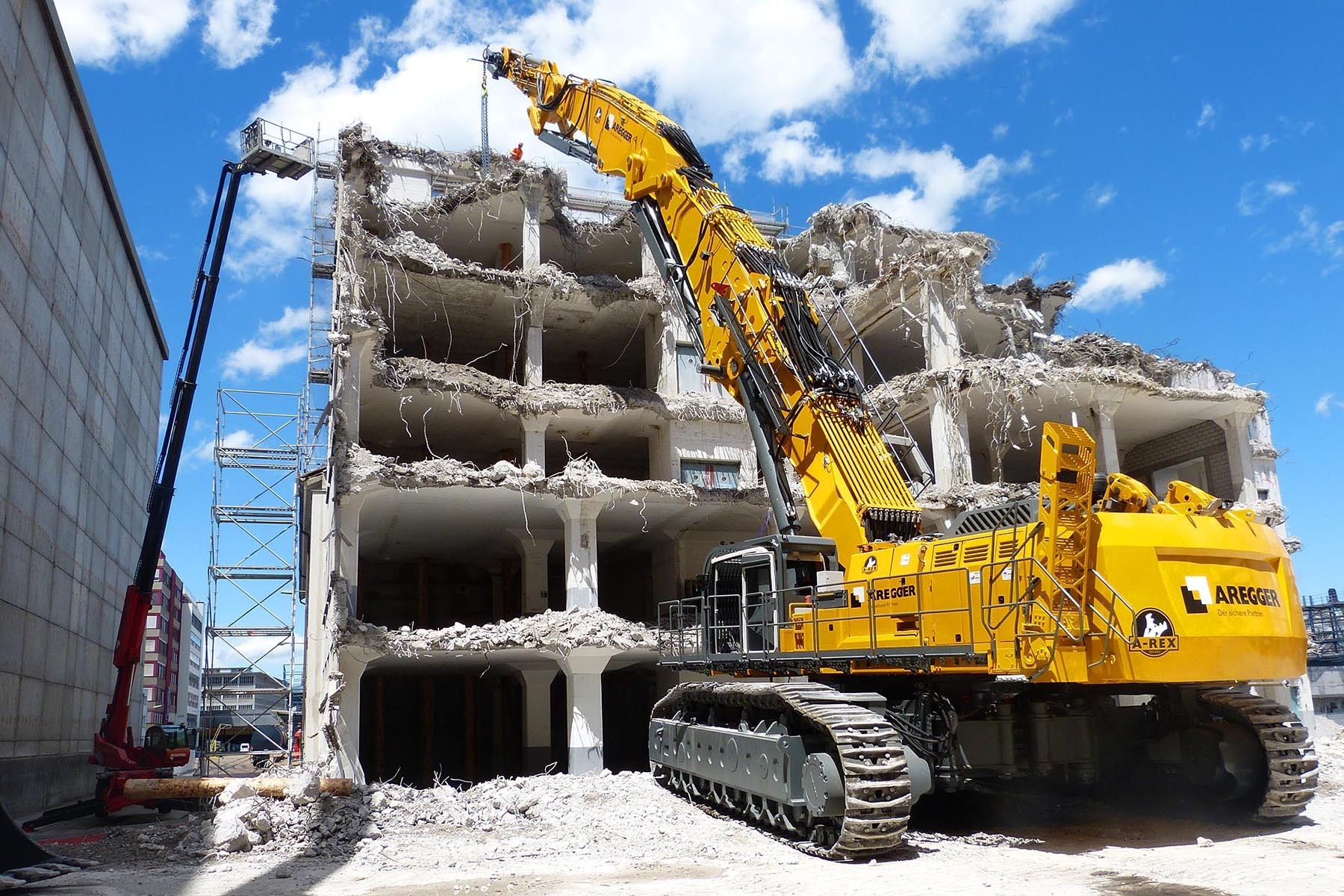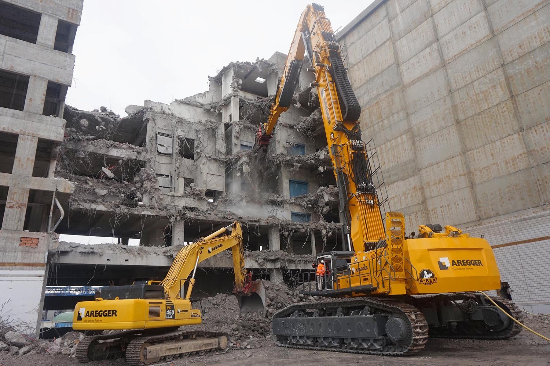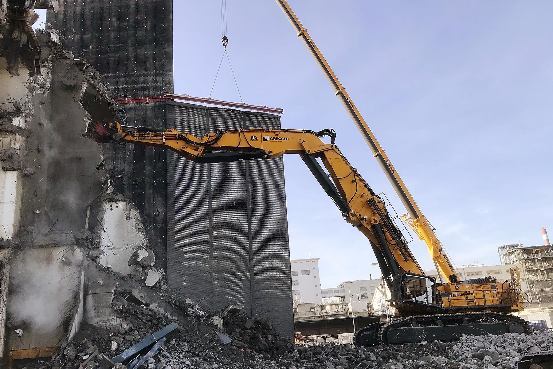 Rückbau von 4 Lager- und Fabrikationsgebäuden in äusserst massiver Bauweise. Erschwerend hinzu kommen die verschiedenen Leitungskanäle rund um die Fabriken. So musste der Bau 2036 rückgebaut werden, ohne die Decke des EG zu überfahren, was höchste Anforderungen an die Maschinen punkte Arbeitshöhe und Reichweite stellte. Mit dem neuen Bagger A-Rex M9300 ging der Rückbau jedoch schnell, sicher und effizient voran. Das Gebäude 2042 ist von einer Rohrbrücke umgeben, welche aus Sicherheitsgründen für 10 Tage abgeschaltet wird. Während dieser Zeit muss der komplette Rückbau des ehemaligen Mahlwerks im Schichtbetrieb erfolgen.