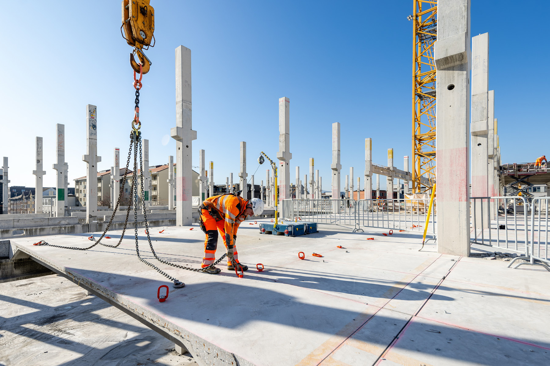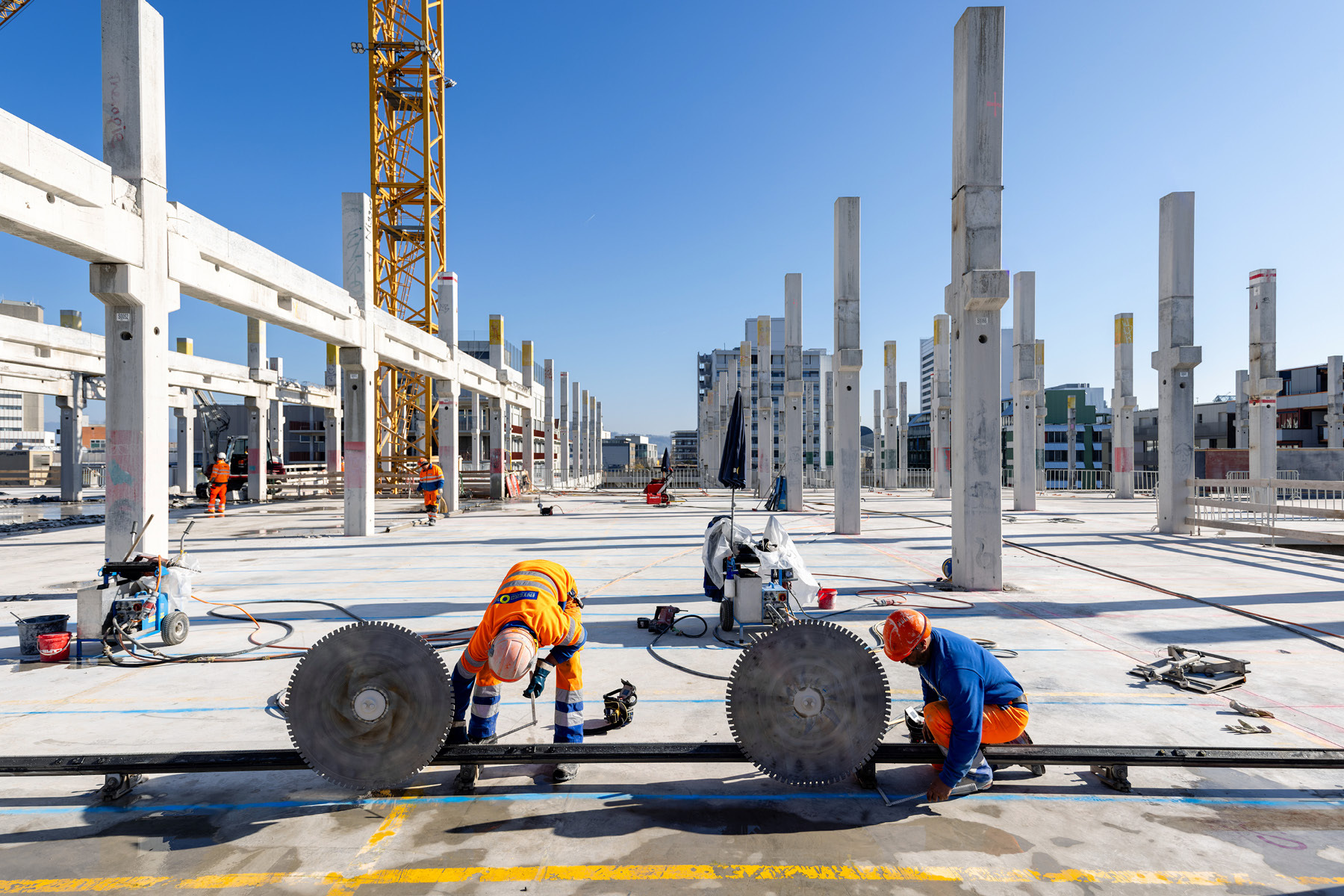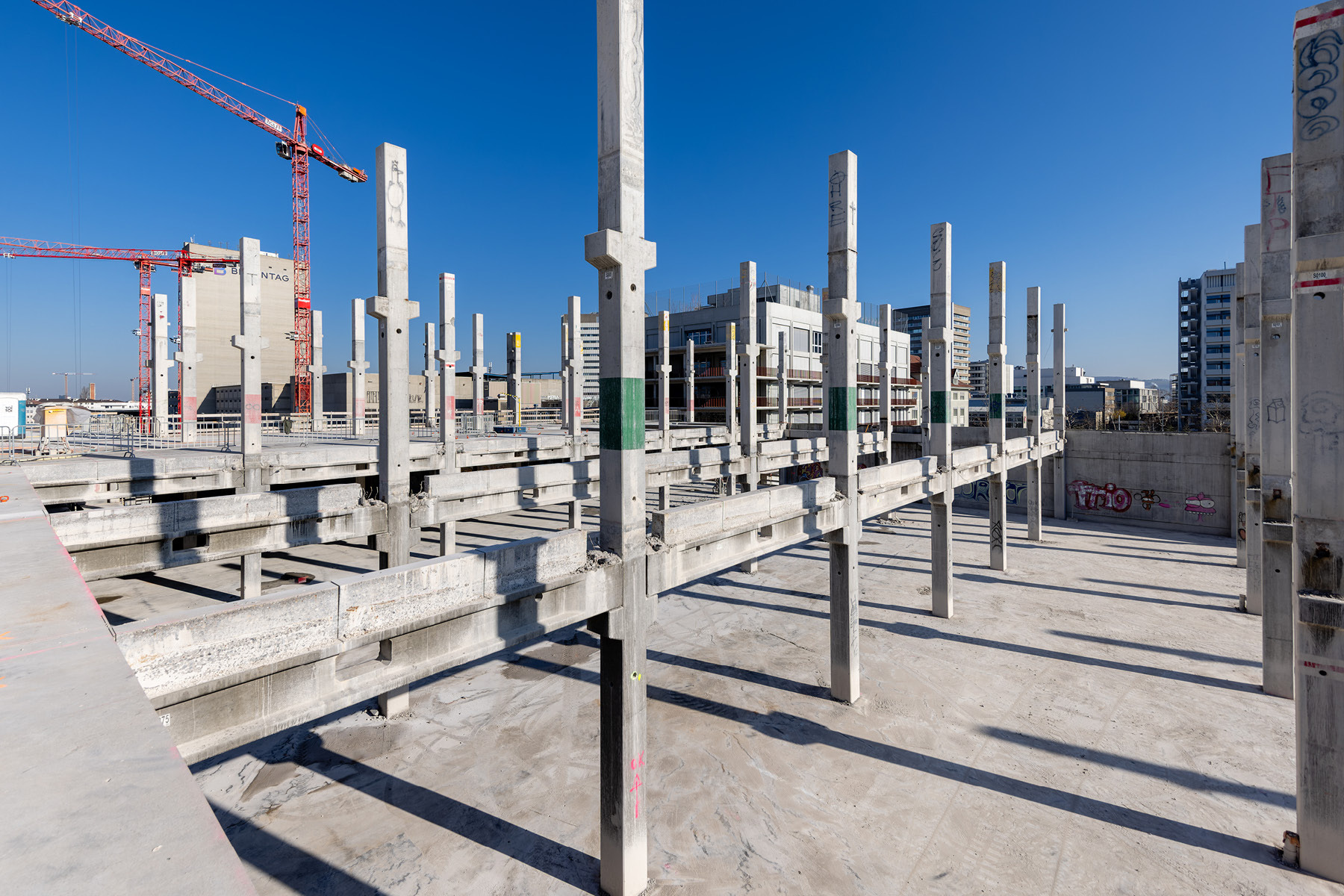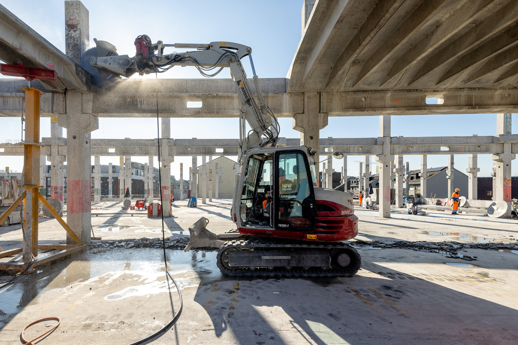 Das ehemalige Industrieareal Volta Nord Baufeld 4 muss weichen. 3 Gebäudeteile werden klassisch rückgebaut und dem Recycling zugeführt. Der Kern bildet das ehemalige LKW-Parkhaus von Coop. Dieses wurde in Elementbauweise erstellt, nun demontiert und als Re-Use Bauteil bei neuen Projekten verbaut. So wird Re-Use gefördert und C02 eingespart. Das Konzept sieht vor, die monolithisch einbetonierten Rippenelementdecken durch verschiedene Verfahren freizulegen und auszubauen. Die neu gewonnenen Decken-, Unterzug- und Stützenelemente sollen in Folgeprojekten wiederverwendet werden. Die Demontage erfordert neue Bauabläufe und Demontagelösungen. Auch die Sanierung von damals verbauten Schadstoffen wie Asbest, PAK, PCB, etc. und durch die Nutzung eingebrachte Belastungen müssen vor Zwischenlagerung der Elemente beachtet werden. Nach erfolgtem Rückbau steht die Altlastensanierung des Bodens an. Anschliessend wird das Baufeld zur Weiterentwicklung freigegeben.