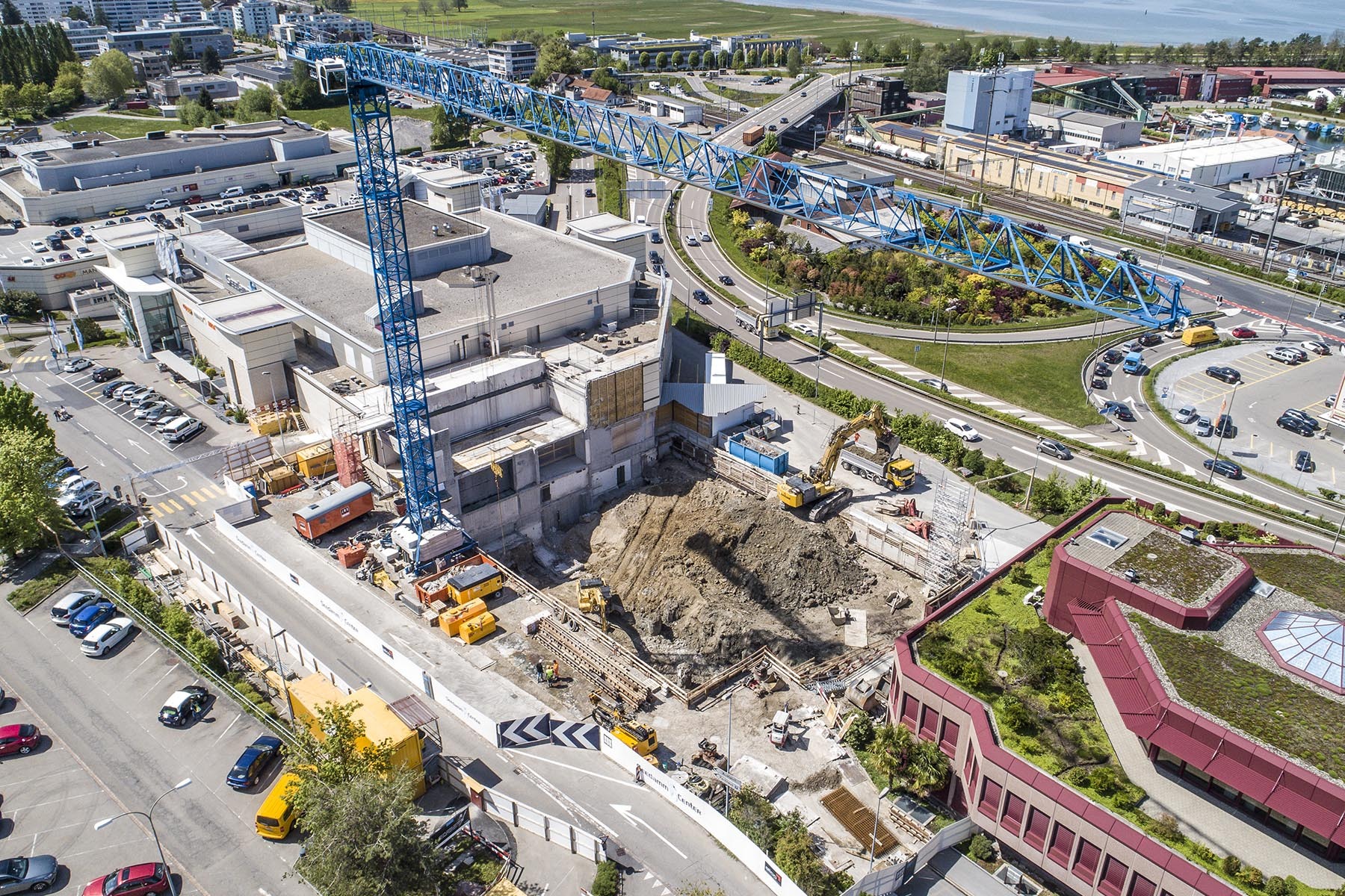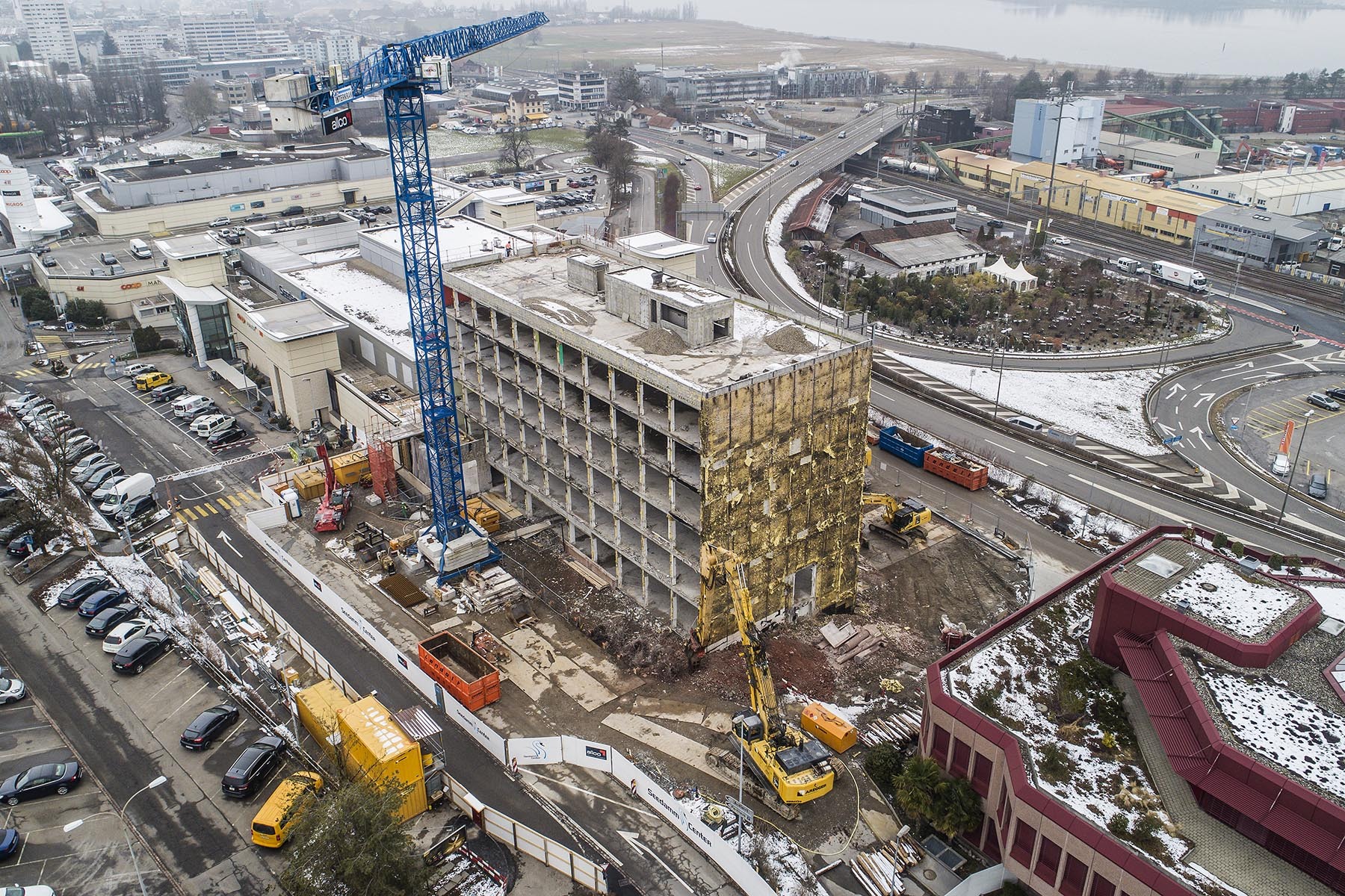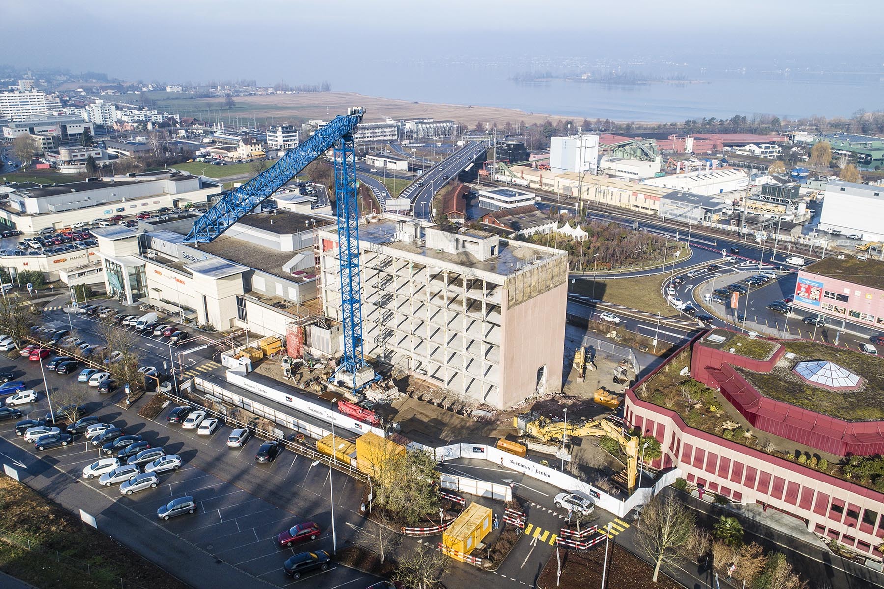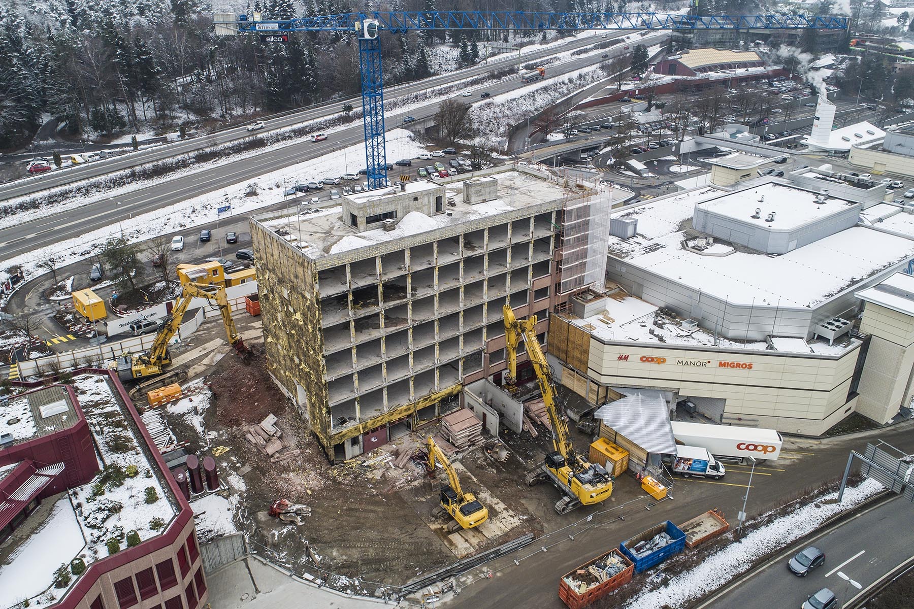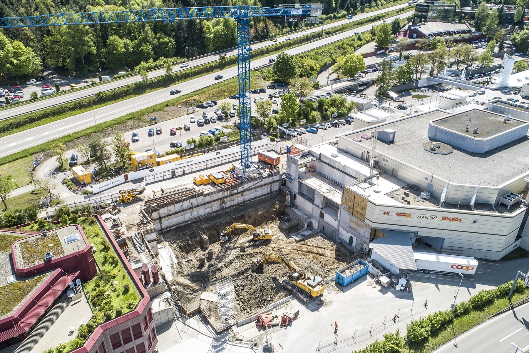 Die Seedamm-Immobilien AG plant einen Ersatzbau für das bestehende Bürogebäude Vögele. Geplant ist ein mehrstöckiges Gebäude mit sechs Untergeschossen. Während den Bauarbeiten bleibt das direkt zusammenhängende Einkaufszentrum Seedammcenter immer in Betrieb. Sämtliche Rückbauarbeiten haben erschütterungsarm zu erfolgen. Bereichsweise müssen die Decken und Wände geschnitten und mit Kran rückgebaut werden, da die bestehenden Anlagen ein konventioneller Rückbau nicht zulassen. Für die sechs Untergeschosse ist eine allseitige Rühlwand mit temporären Vorspannankern erforderlich. Die Baugrube weist eine Gesamttiefe von 18m auf.