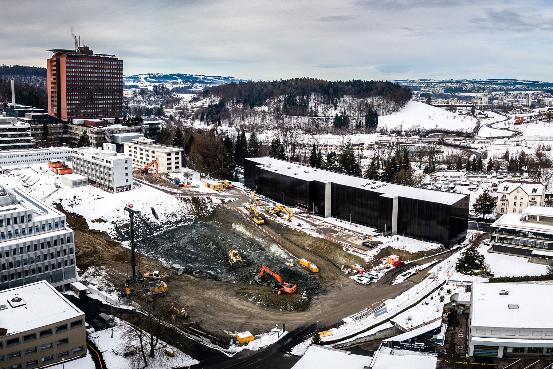 Durch das Bauvorhaben werden Kinderspital und Frauenklinik unter einem Dach vereint. Die ersten Vorarbeiten haben bereits begonnen. Mit dem Aushub wird gegen Ende Jahr gestartet. Die Ausführung beträgt 14 bis 17 Monate. Pro Tag werden rund 50 LKW's insgesamt 180'000 m3 Erde abführen.