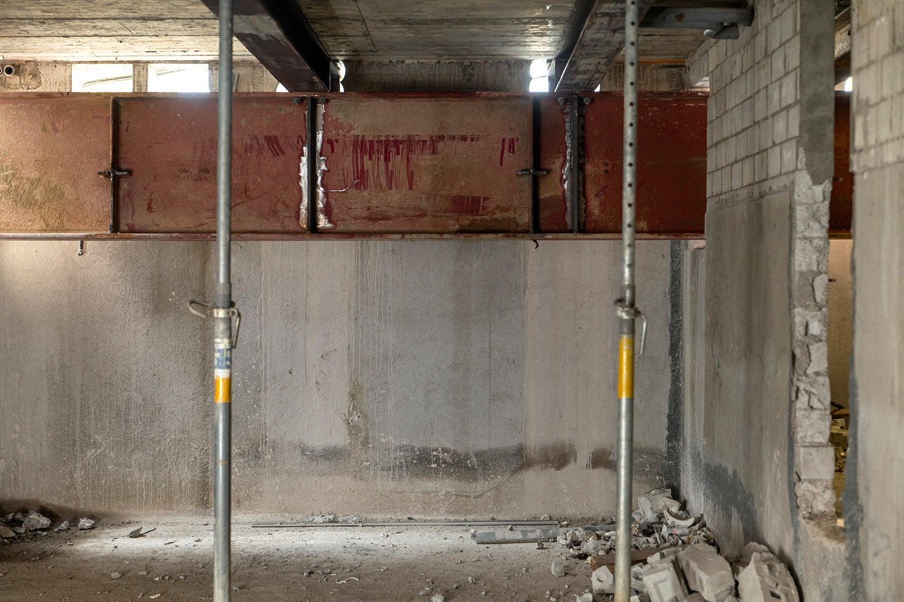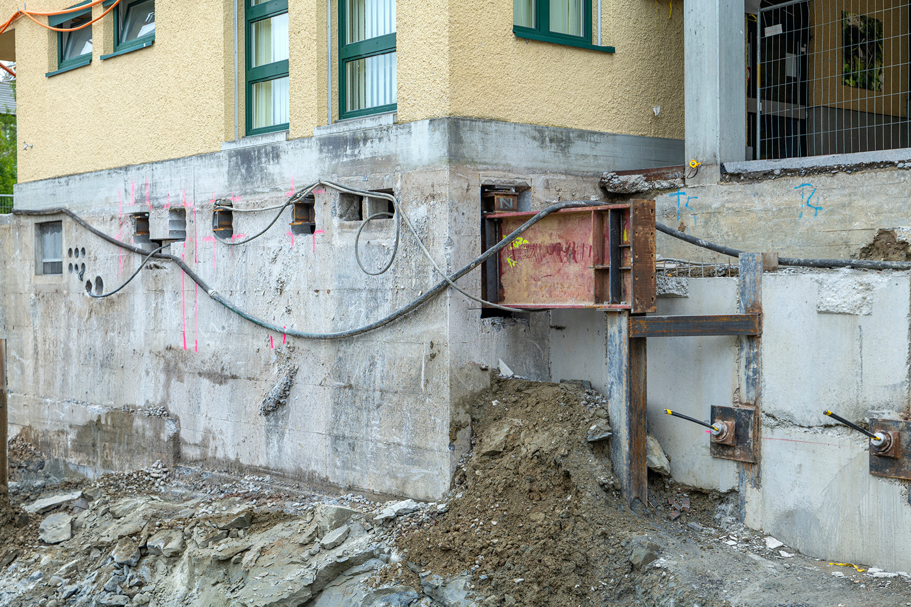 Anfang Juli begann die zweite Aushubetappe, die deutlich anspruchsvoller ist, da das bestehende Schulgebäude abgefangen und anschliessend unterfangen werden muss. Während bei der ersten Etappe die Böschung mit einer Nagelwand gesichert wurde, kommen in der zweiten Etappe Rühl- und Nagelwände zum Einsatz.