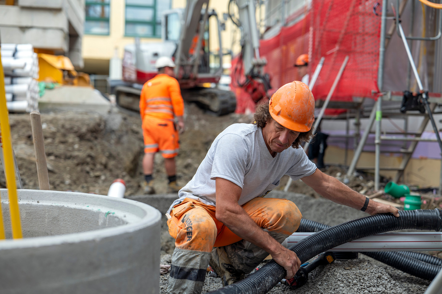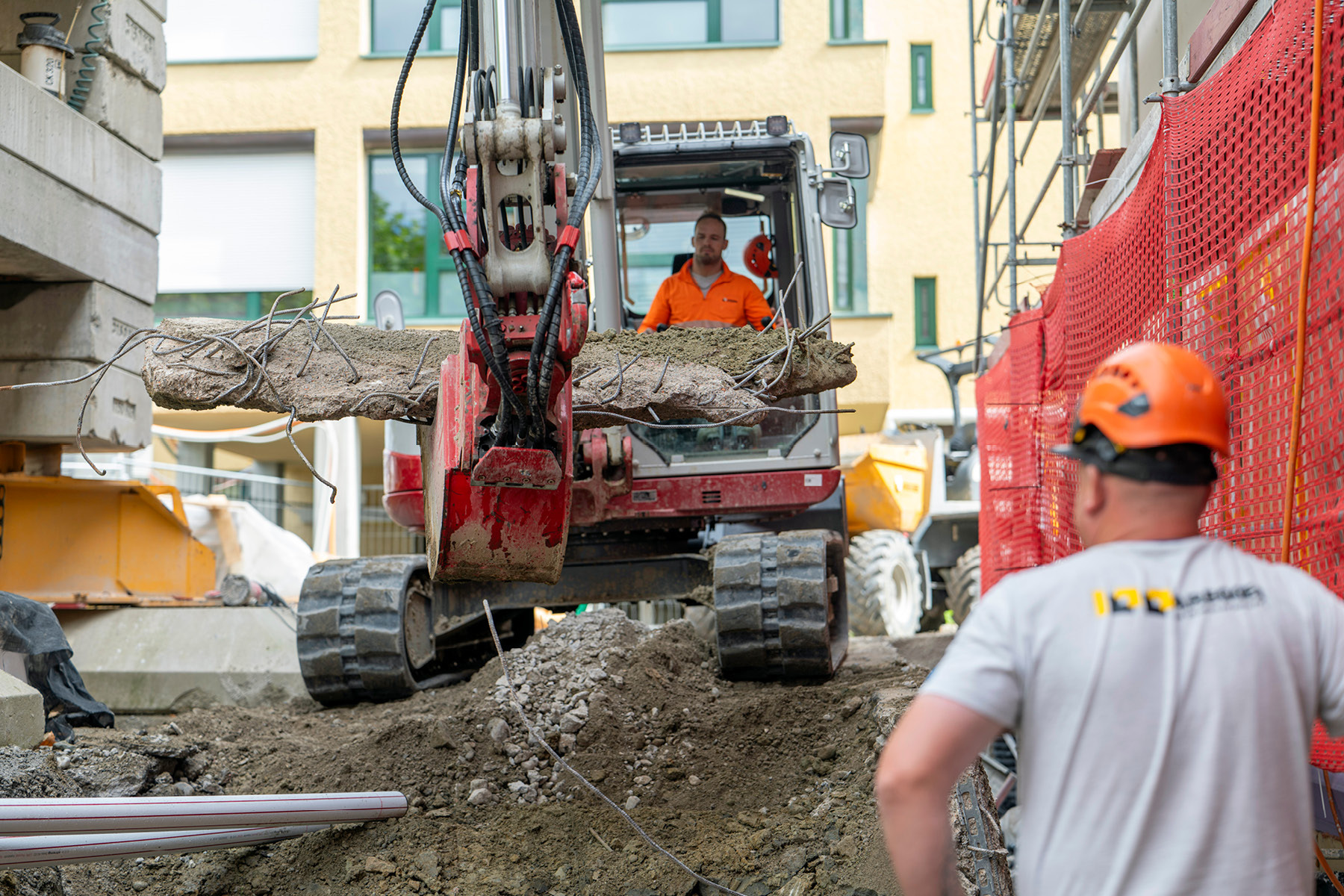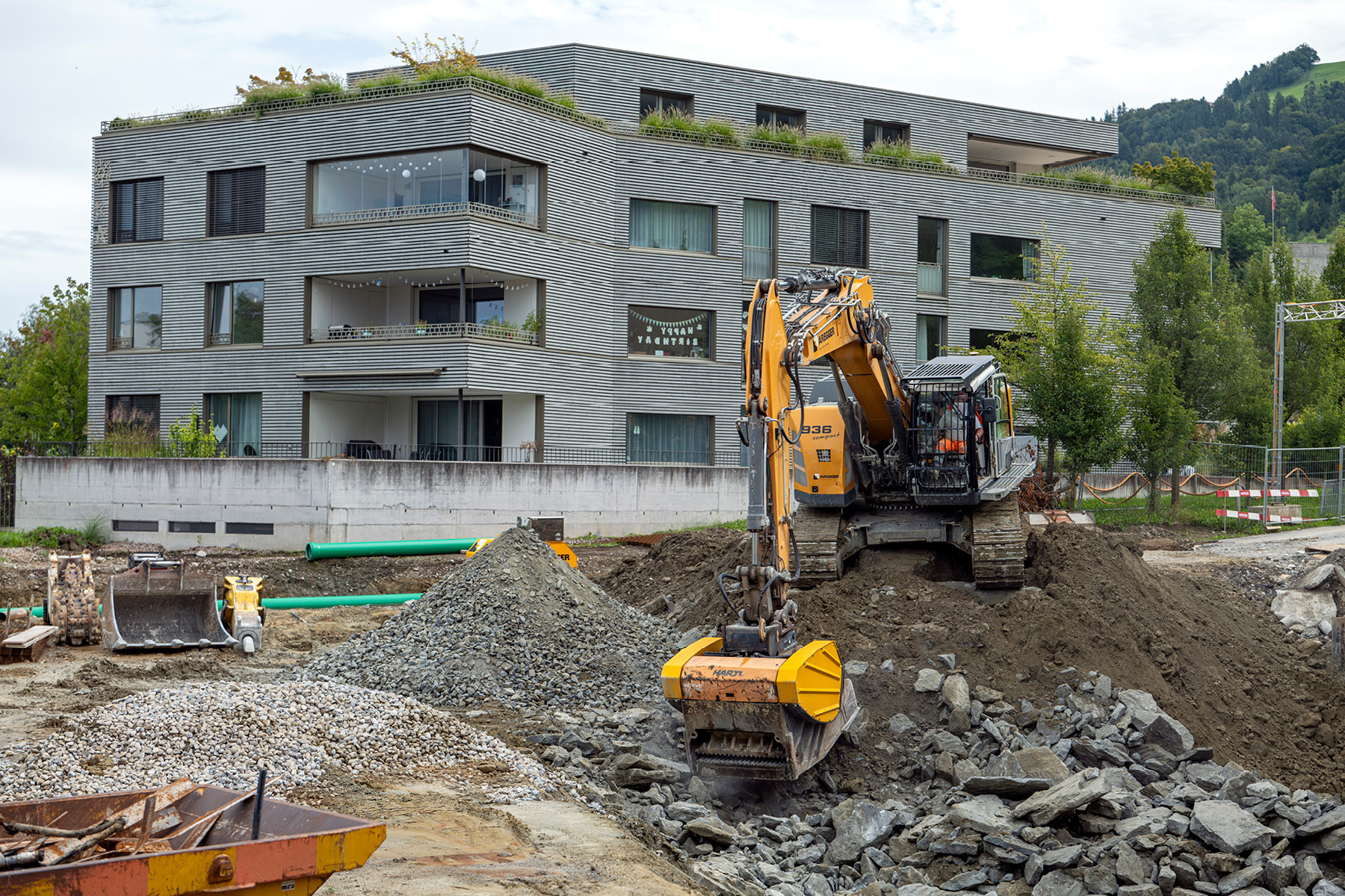 Trotz unerwartet hohem Felsanteil im Boden und starkem Hangwasser konnte der enge Zeitplan eingehalten werden. Von Vorteil war dabei, dass dank des späteren Hochbauauftrags Synergien genutzt werden konnten – etwa beim Bau der Werk- und Entwässerungsleitungen.