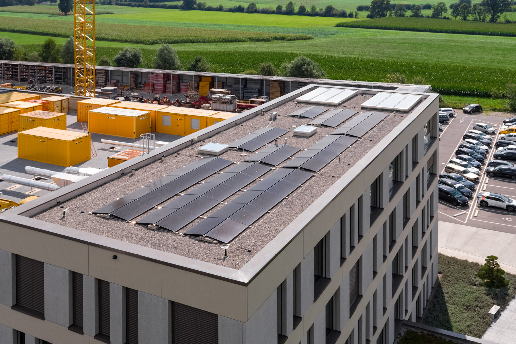 Die Baubranche trägt aufgrund ihres hohen Ressourcenverbrauchs und beträchtlicher Emissionen eine grosse Verantwortung. Diese nehmen wir wahr: Unser Eigenprojekt, der Hauptsitz in Buttisholz, setzt mit 100% Recyclingbeton und einer Re-Use-Stahlkonstruktion für die Werkhalle ein Vorbild für nachhaltiges und zirkuläres Bauen. Auch bei der Energiegewinnung wird Nachhaltigkeit grossgeschrieben: Mehr als 20 Erdsonden und eine PV-Anlage, die seit dem Neubau bereits auf eine Fläche von rund 1'600m² erweitert wurde, zeigen, dass sich die Aregger-Gruppe aktiv für erneuerbare Energien einsetzt. Mit unseren Solarpanels decken wir problemlos tägliche Lastspitzen ab und können zudem unsere Elektroautos an den 12 firmeneigenen Ladestationen aufladen.